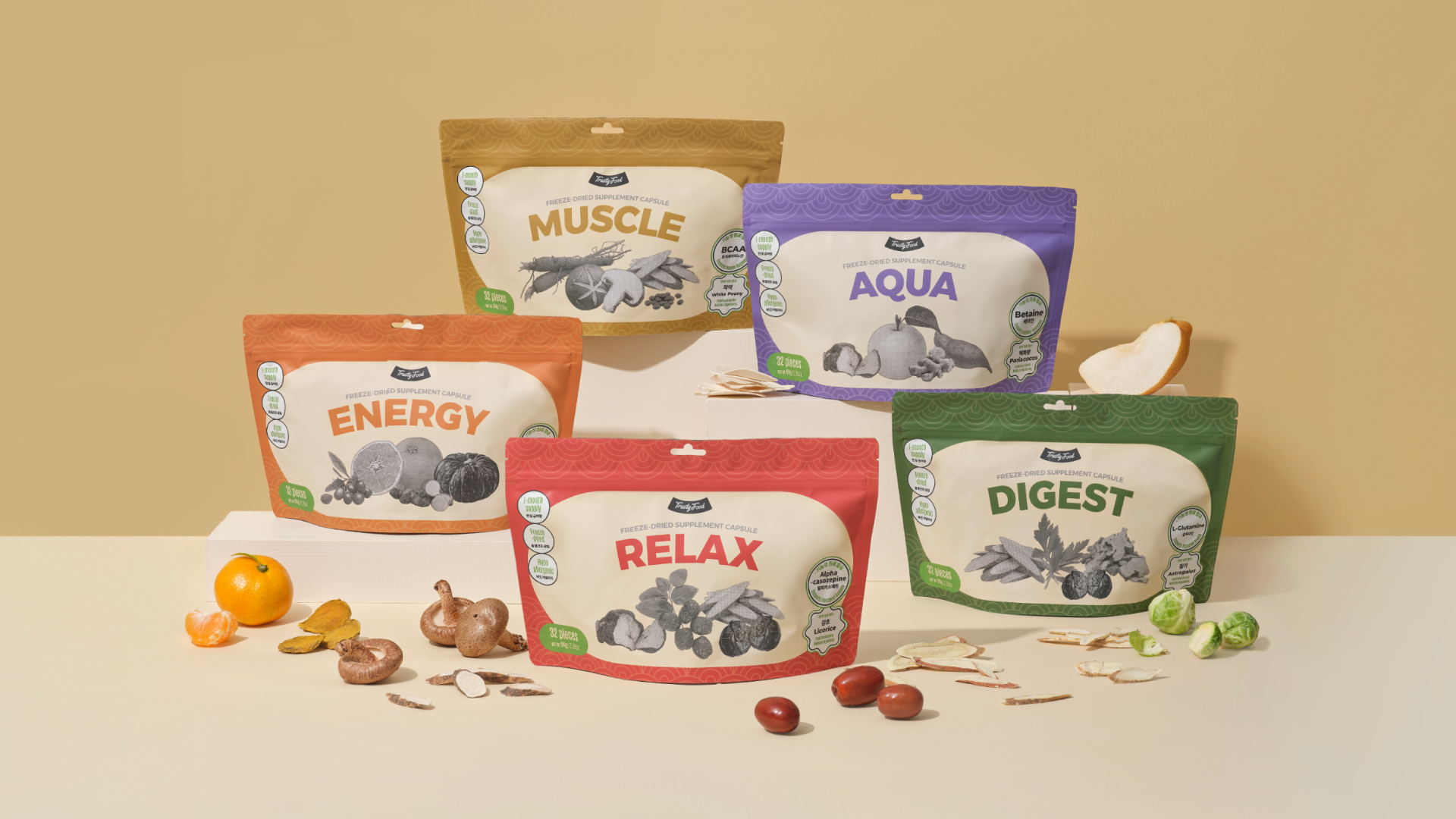 저속노화 펫푸드 브랜드 트러스티푸드의 프리미엄 동결건조 영양제 5종 패키지 디자인